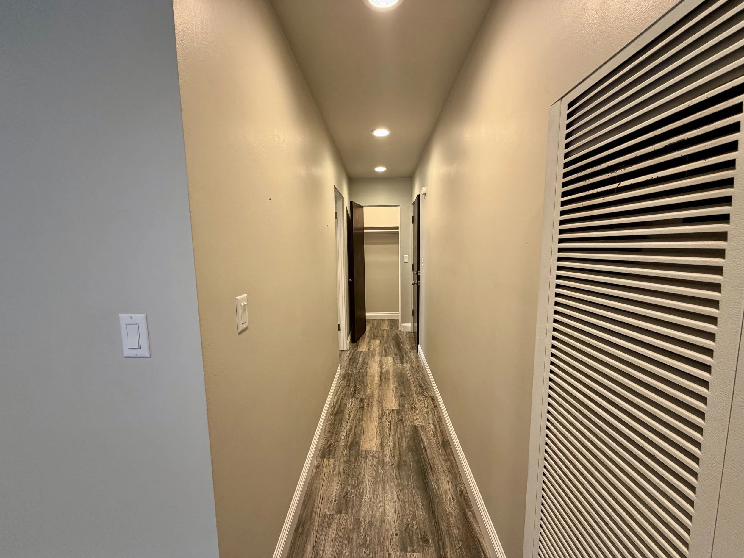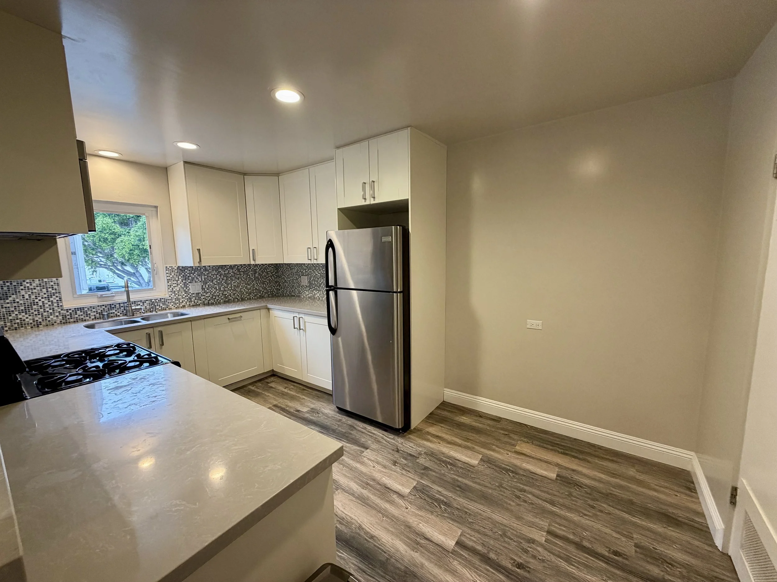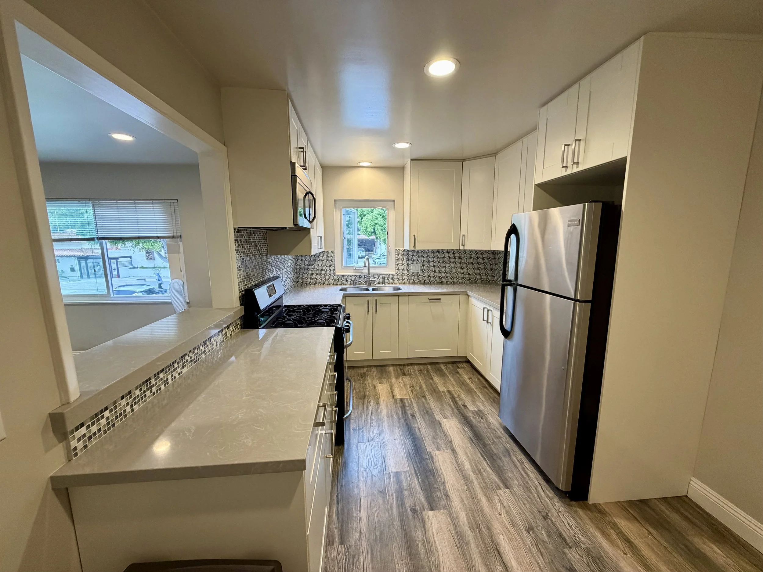 The apartment has been completely remodeled throughout and features new wood laminate and tile flooring, stainless steel appliances with a custom panel dishwasher, quartz countertops in both the kitchen and bathroom, a sleek glass-enclosed shower, recessed LED lighting, and generous storage. A reserved parking space is included and conveniently located directly outside your door.