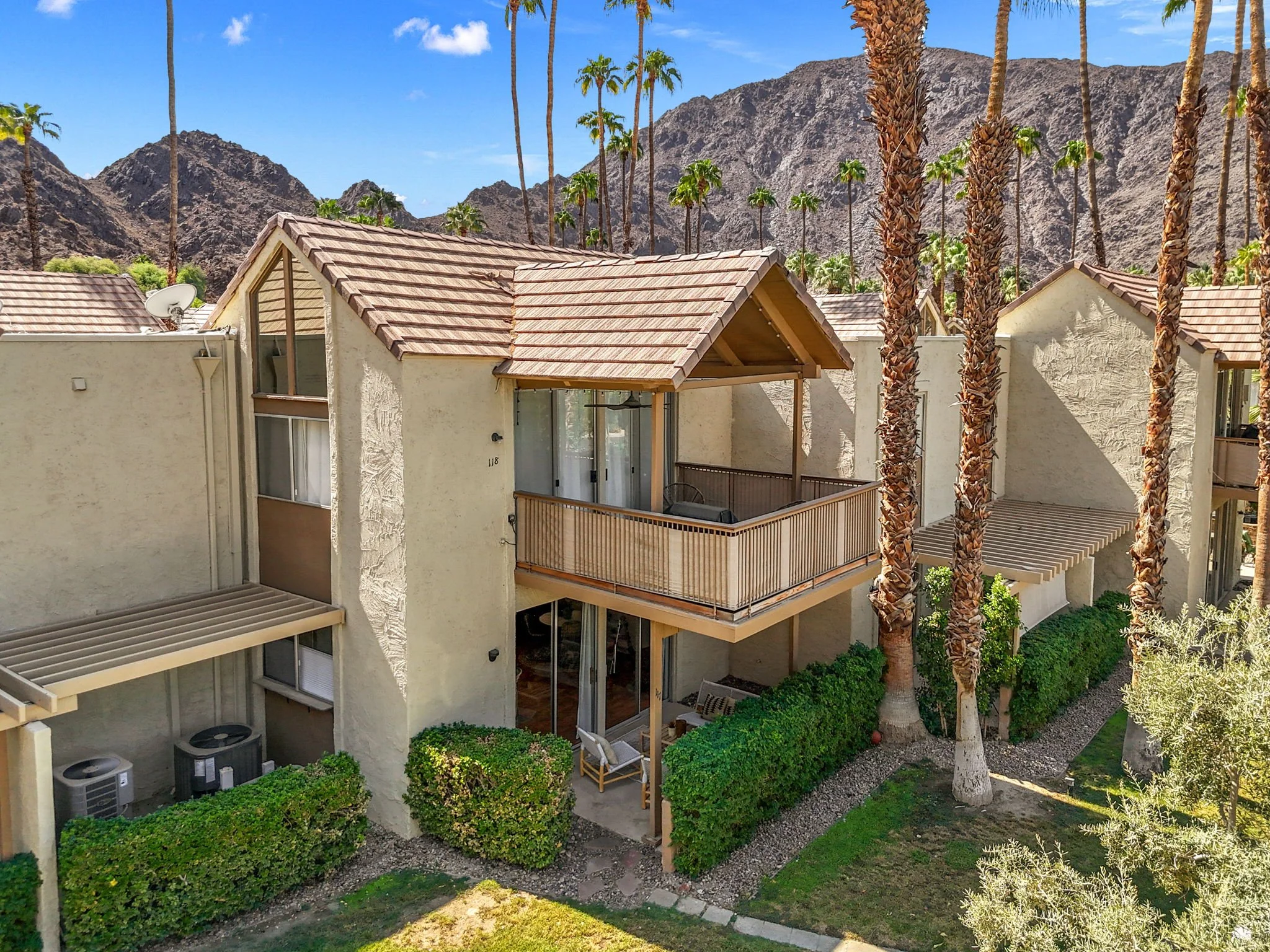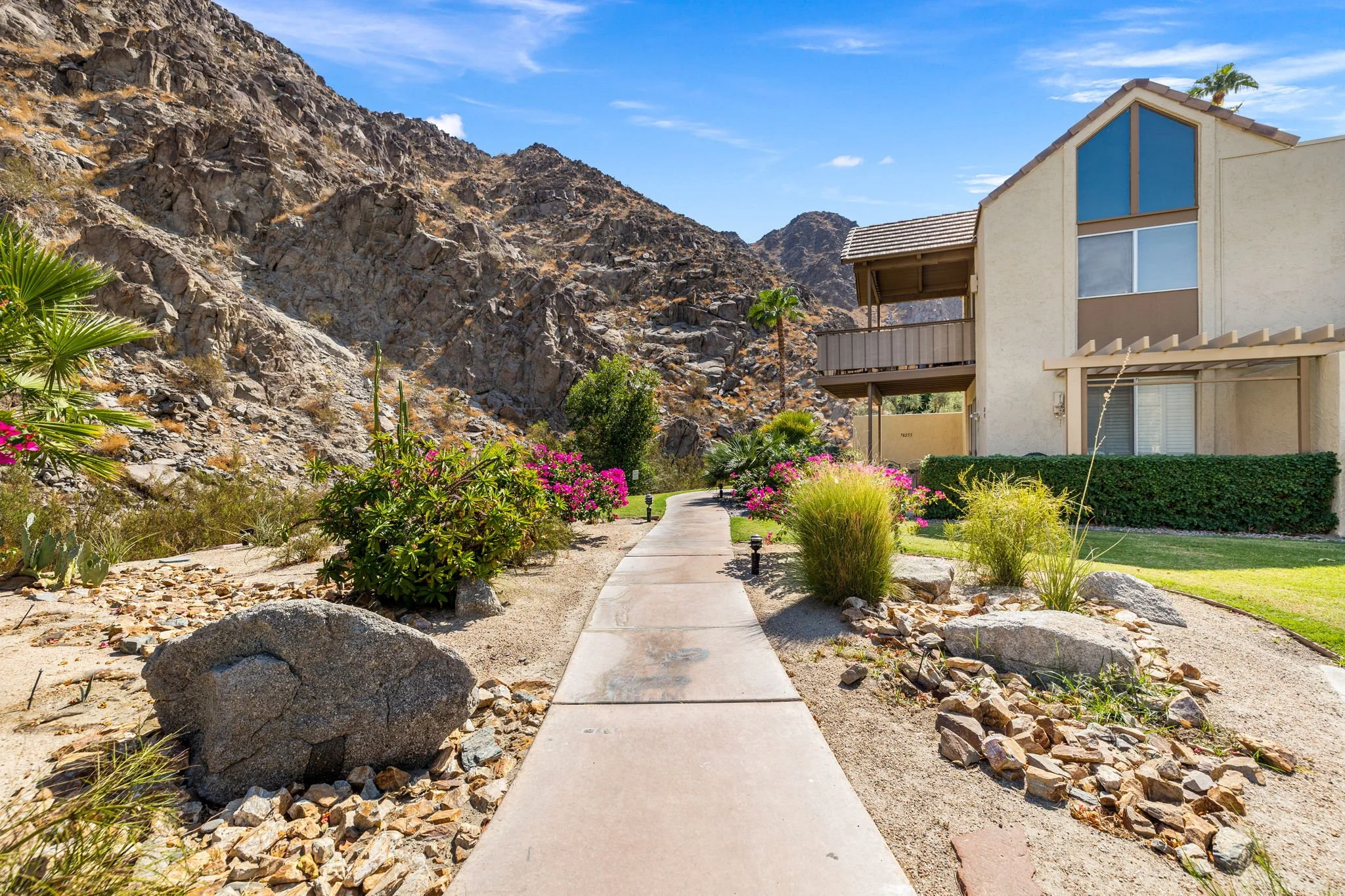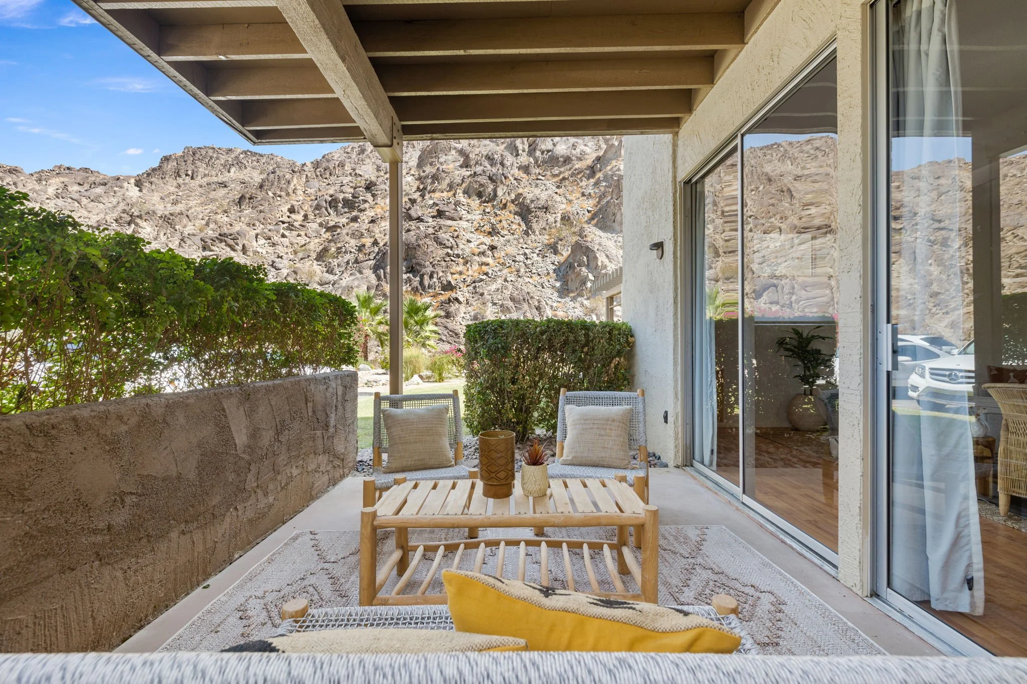 A darling condo located in Indian Wells that you CAN rent short-term for under $400,000? Yes please! Tucked up against the mountain sits this charming little bungalow that is designed desert-BOHO and is cute as can be! As an all lower-level unit, you won't have to mess with any stairs and you have not one, but two private patios to take in those incredible mountain views! This is not the studio plan; it is the larger plan featuring almost 900 square feet with living & dining area off your kitchen & a private primary bed/bath plus another bathroom with laundry area. The kitchen features granite slab counters and looks out to your light and bright dining and living room. Mountain Cove is a 24-hour guard gated community located in the heart of Indian Wells & is surrounded by mountains, palm trees, & sparkling pools to enjoy! IID electric for lower utility bills! STR ok! See private notes on other resident perks! Furniture package available outside of escrow so you can move right in and start enjoying the desert and all it has to offer!