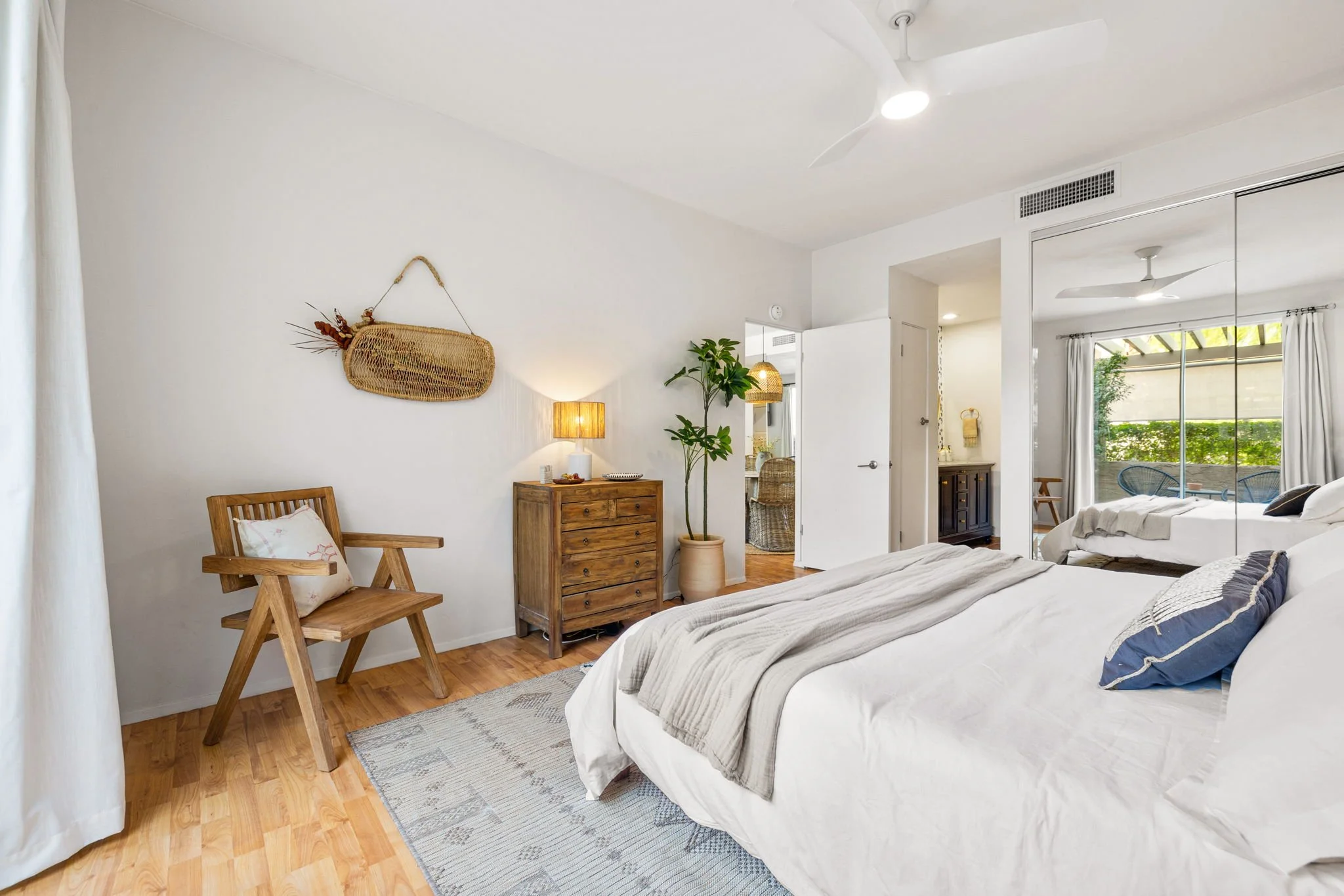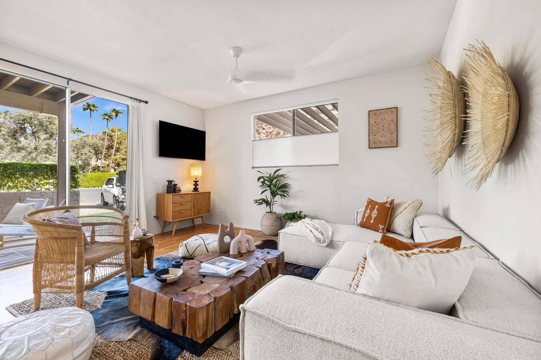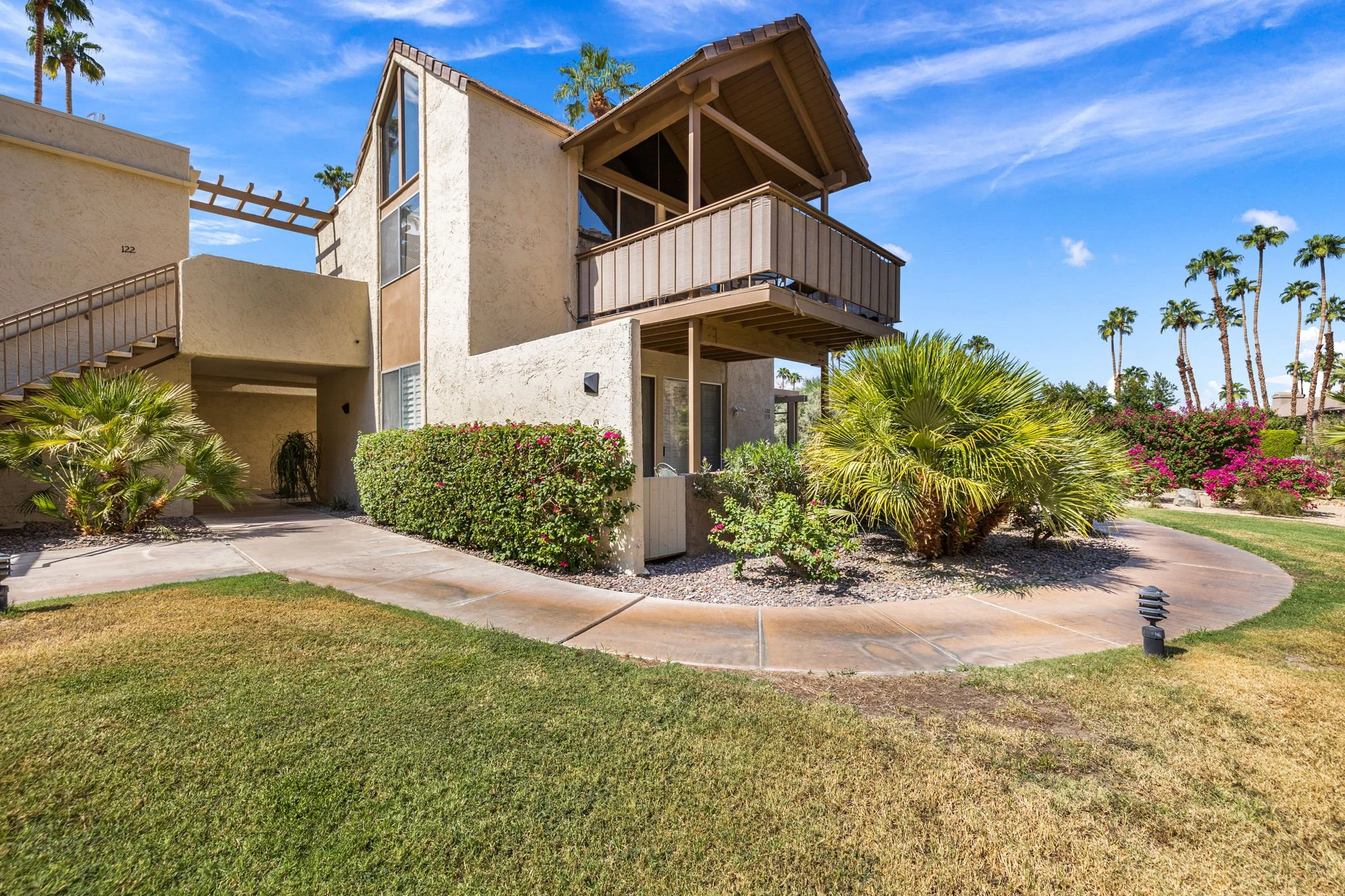 A darling condo located in Indian Wells that you CAN rent short-term for under $400,000? Yes please! Tucked up against the mountain sits this charming little bungalow that is designed desert-BOHO and is cute as can be! As an all lower-level unit, you won't have to mess with any stairs and you have not one, but two private patios to take in those incredible mountain views! This is not the studio plan; it is the larger plan featuring almost 900 square feet with living & dining area off your kitchen & a private primary bed/bath plus another bathroom with laundry area. The kitchen features granite slab counters and looks out to your light and bright dining and living room. Mountain Cove is a 24-hour guard gated community located in the heart of Indian Wells & is surrounded by mountains, palm trees, & sparkling pools to enjoy! IID electric for lower utility bills! STR ok! See private notes on other resident perks! Furniture package available outside of escrow so you can move right in and start enjoying the desert and all it has to offer!