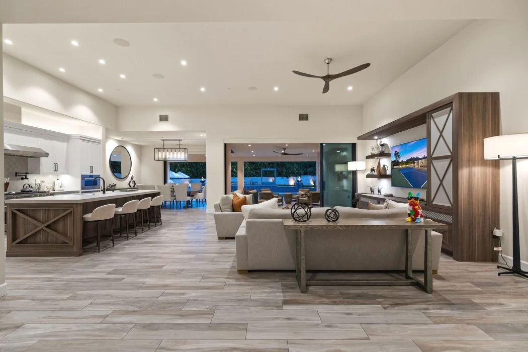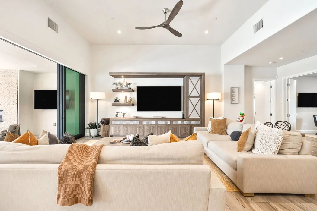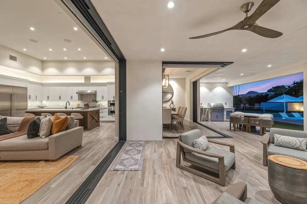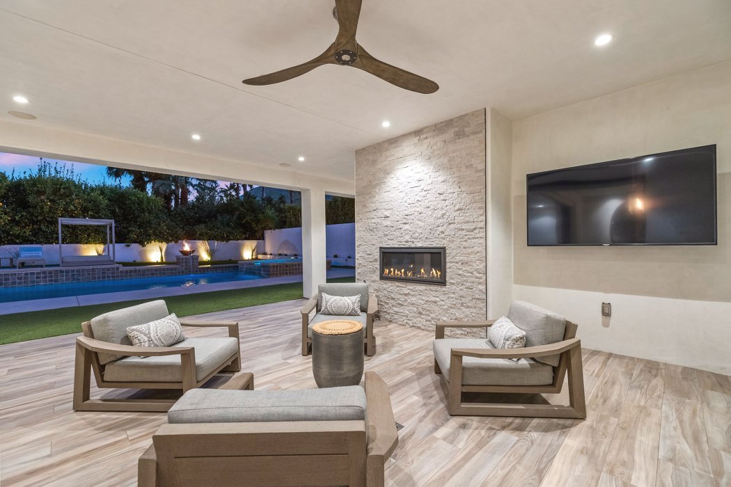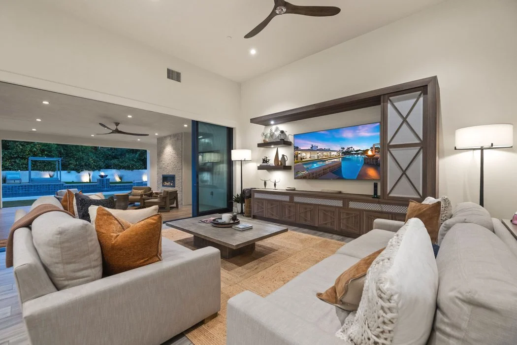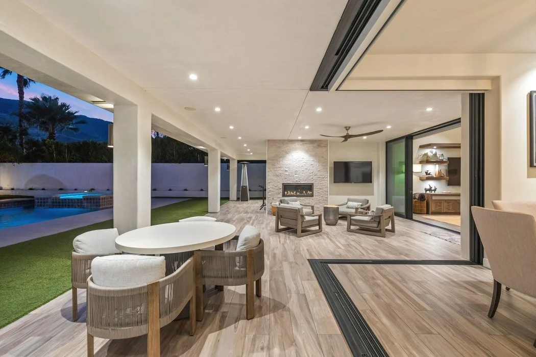 Inside, the home spans approximately 3,700 square feet and showcases sleek contemporary architecture with soaring ceilings and expansive south-facing pocket doors that blur the line between indoors and out. The great room anchors the home with designer furnishings, a striking fireplace, and a large TV, all framed by tranquil desert views.