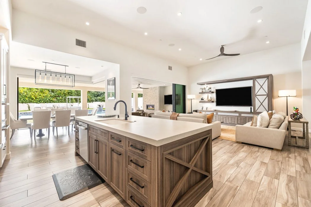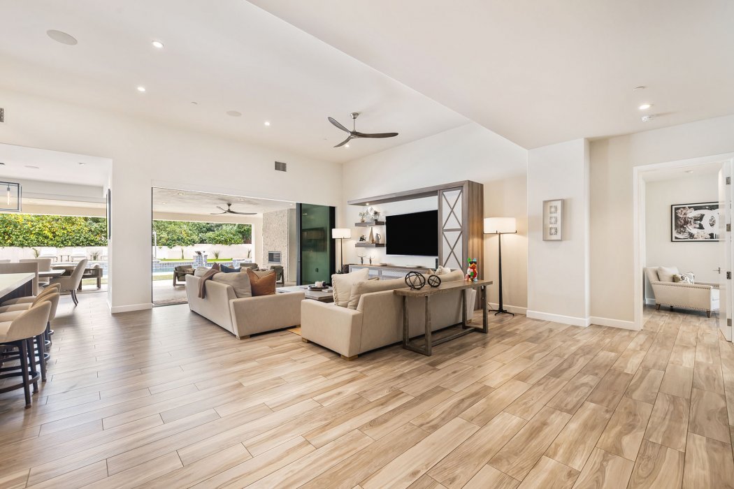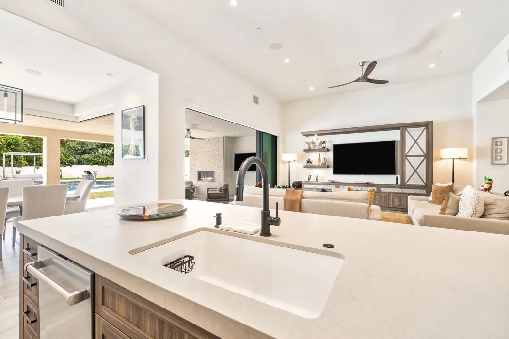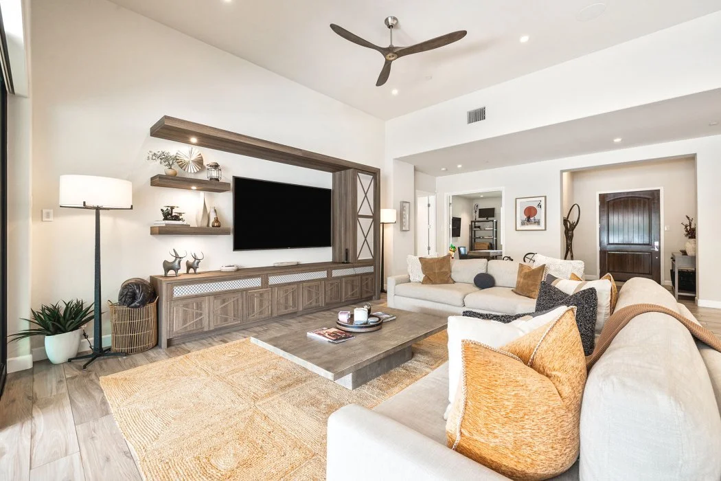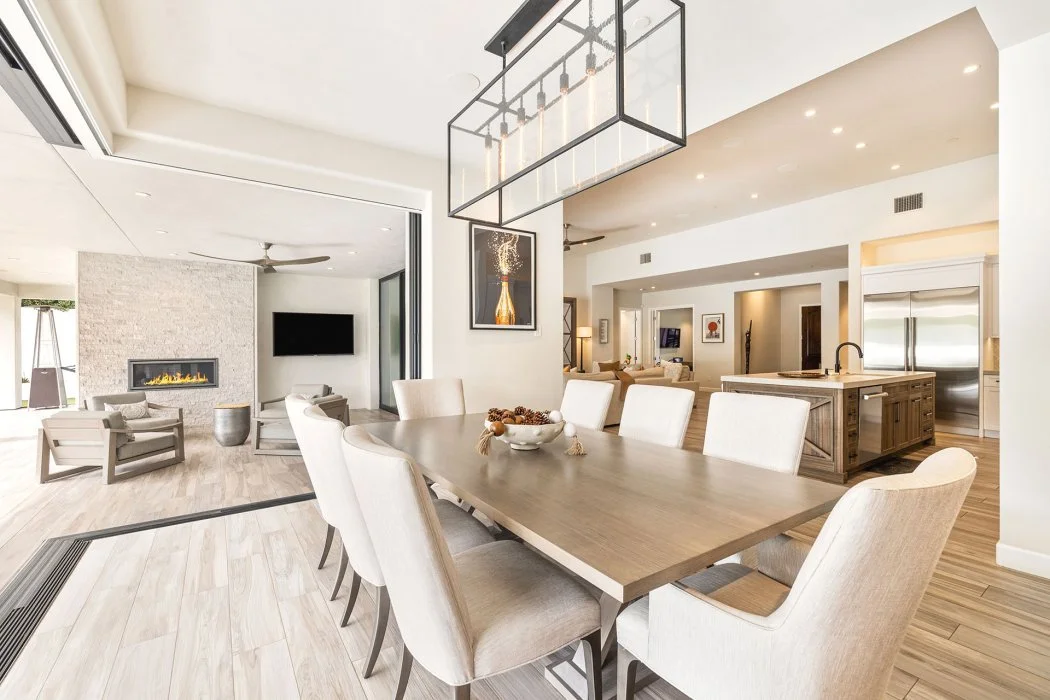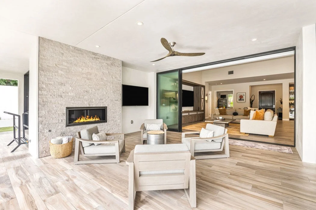 Inside, the home spans approximately 3,700 square feet and showcases sleek contemporary architecture with soaring ceilings and expansive south-facing pocket doors that blur the line between indoors and out. The great room anchors the home with designer furnishings, a striking fireplace, and a large TV, all framed by tranquil desert views.