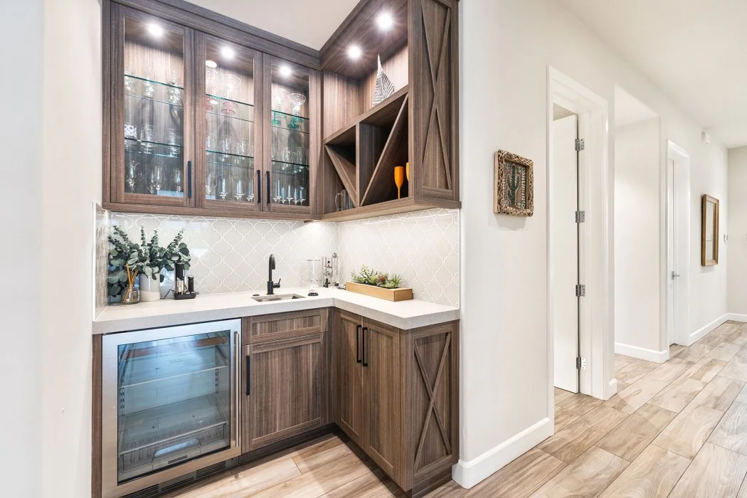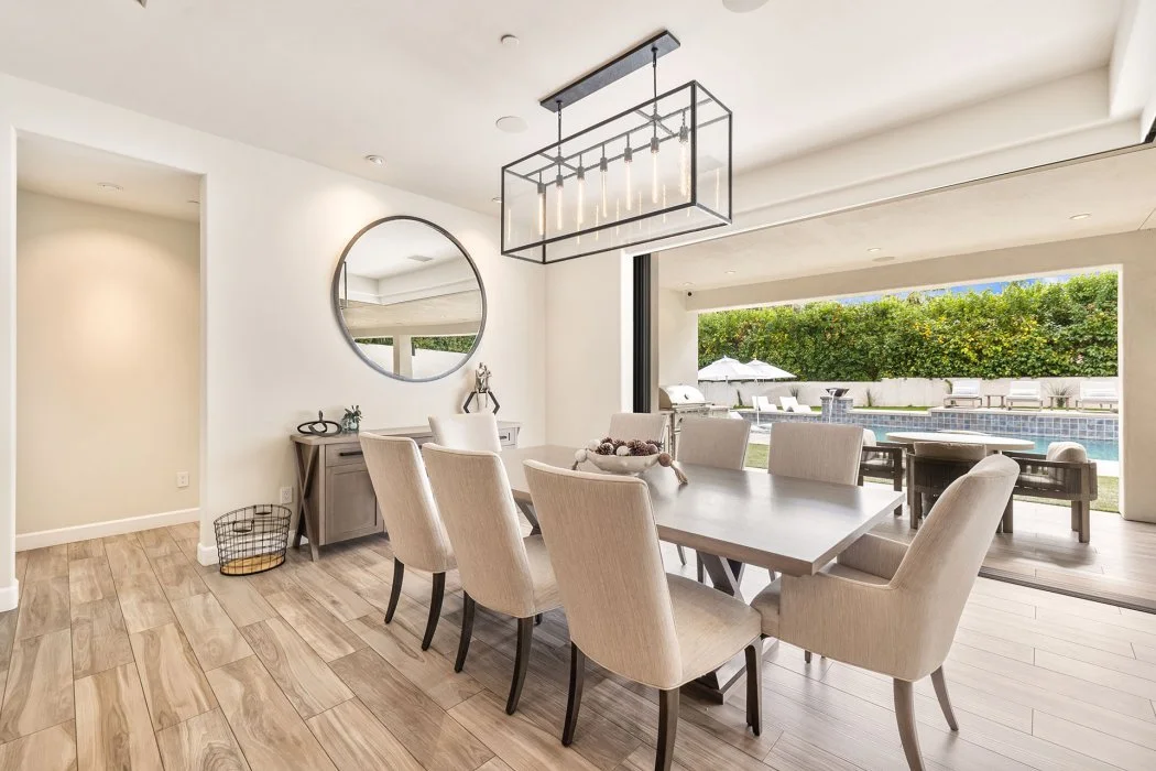 The chef’s kitchen is fully equipped with Wolfe and Asko appliances, a Sub-Zero refrigerator, quartz countertops, and an oversized island with seating for four. Entertaining is effortless thanks to a separate wet bar with refrigerator, a walk-in butler’s pantry, and a beautiful indoor-outdoor dining area that comfortably seats eight.