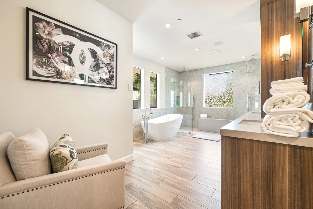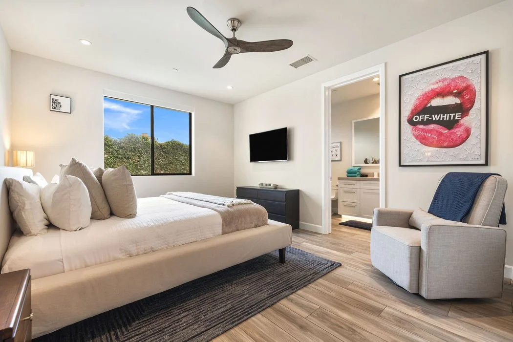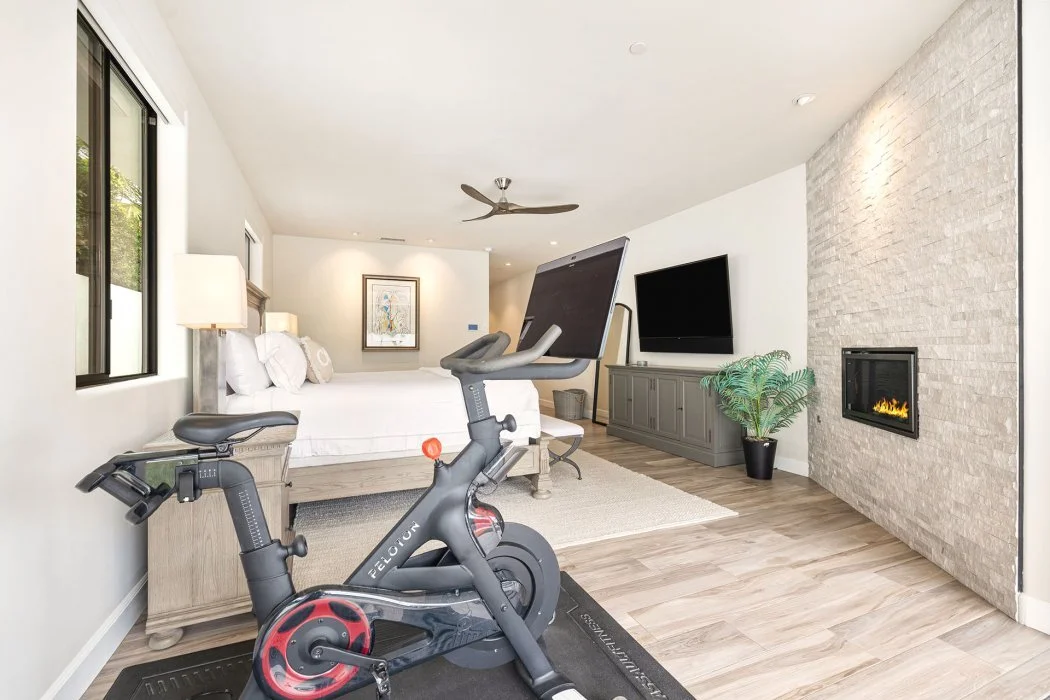 Primary Suite: A luxurious retreat with a king bed, TV, fireplace, direct pool access, and a spa-inspired en suite bath featuring a soaking tub, walk-in shower, and generous closet space. A Peloton bike is also included.