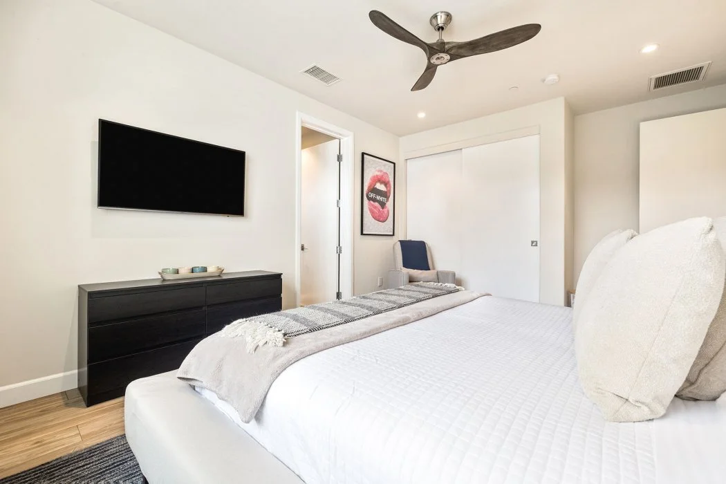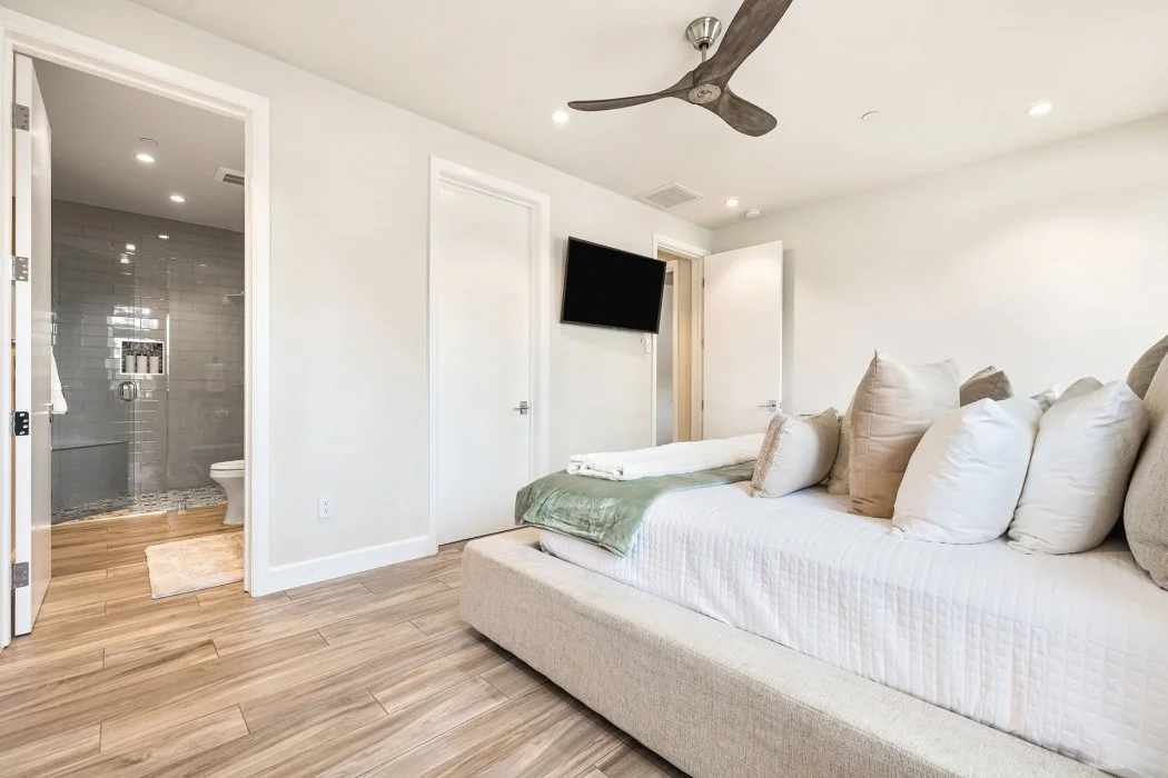 Bedroom Four: King bed, TV, and easy access to the nearby hall bathroom with walk-in shower.